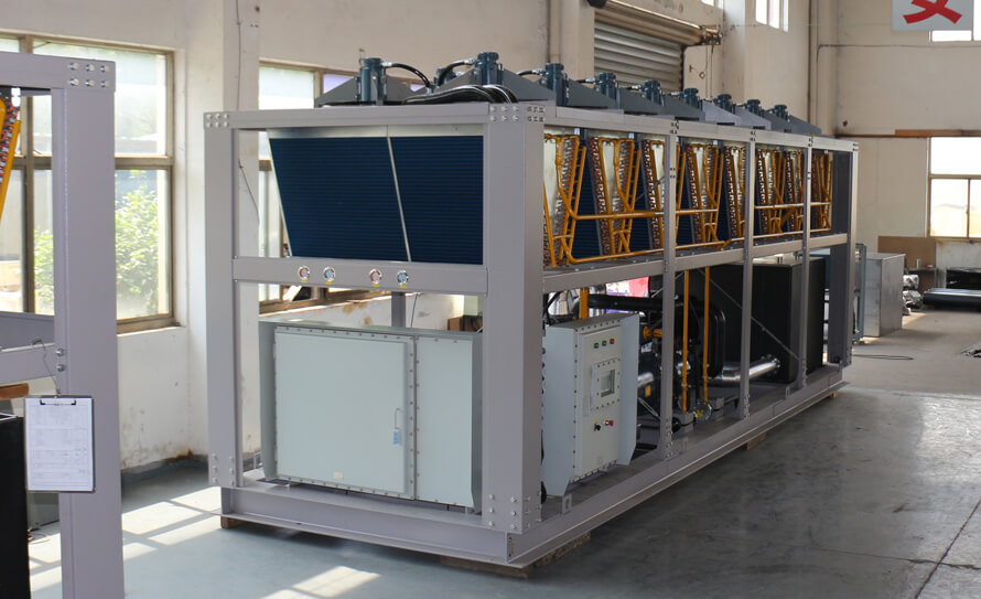 2、低溫型螺桿式化工防爆冷水機:控溫范圍-5℃~-120℃,可選用鹽水、乙二醇、酒精等為載冷劑;